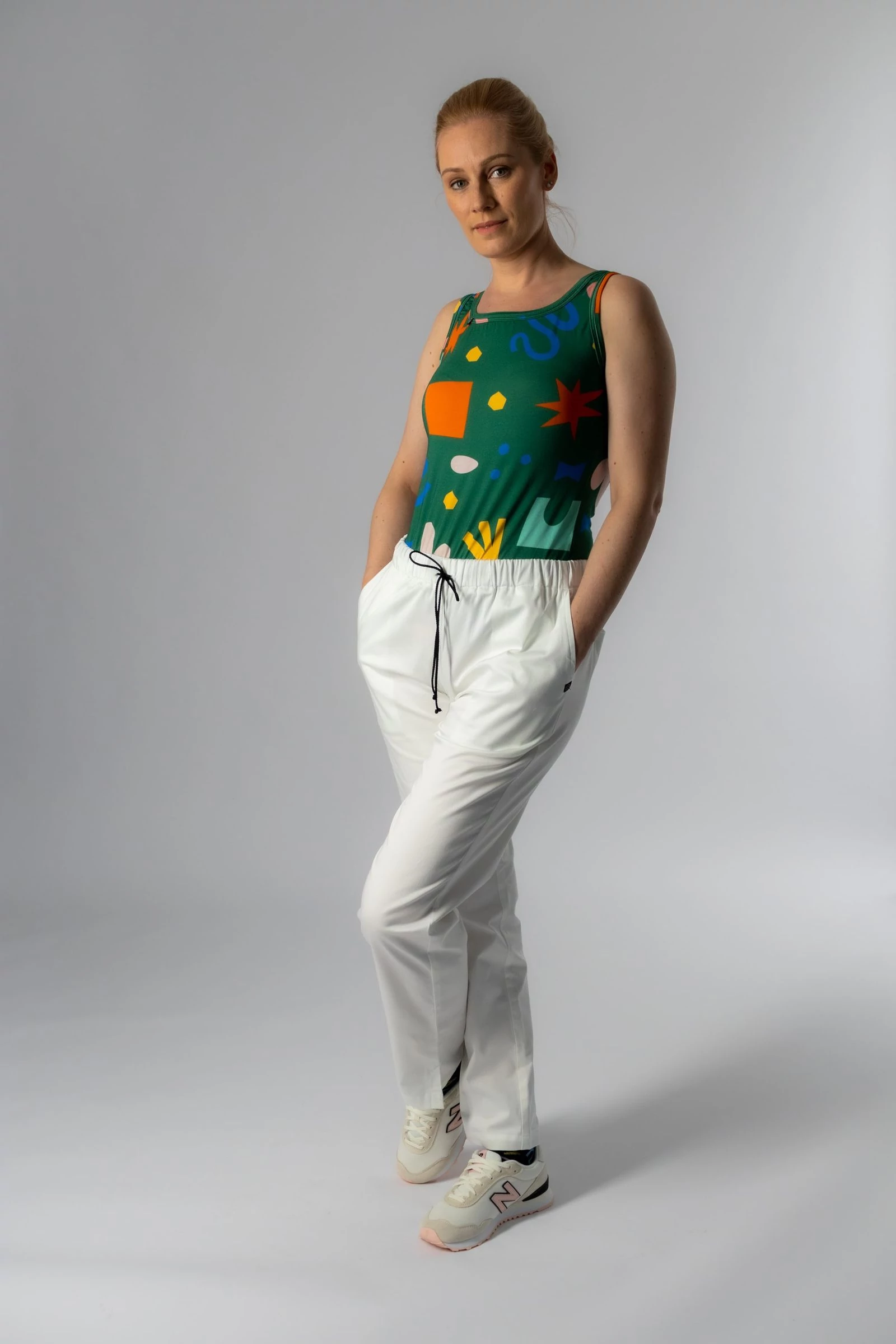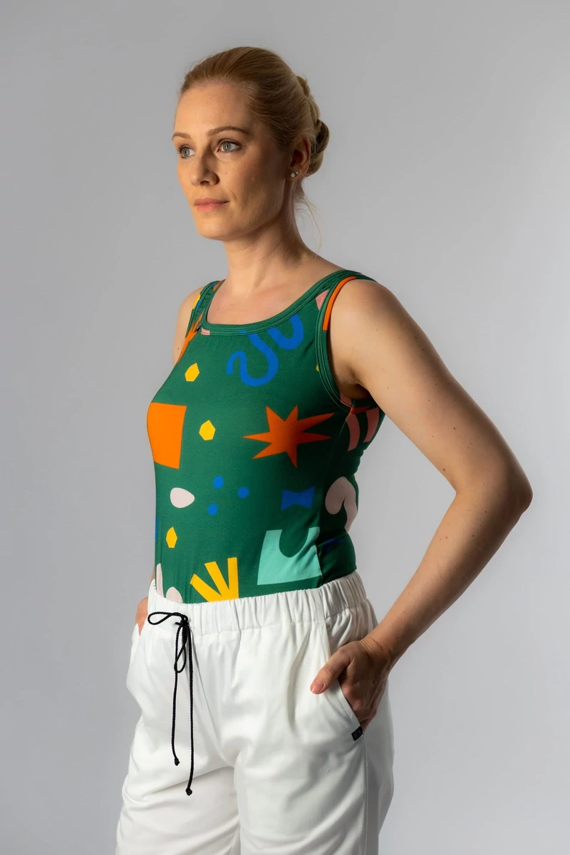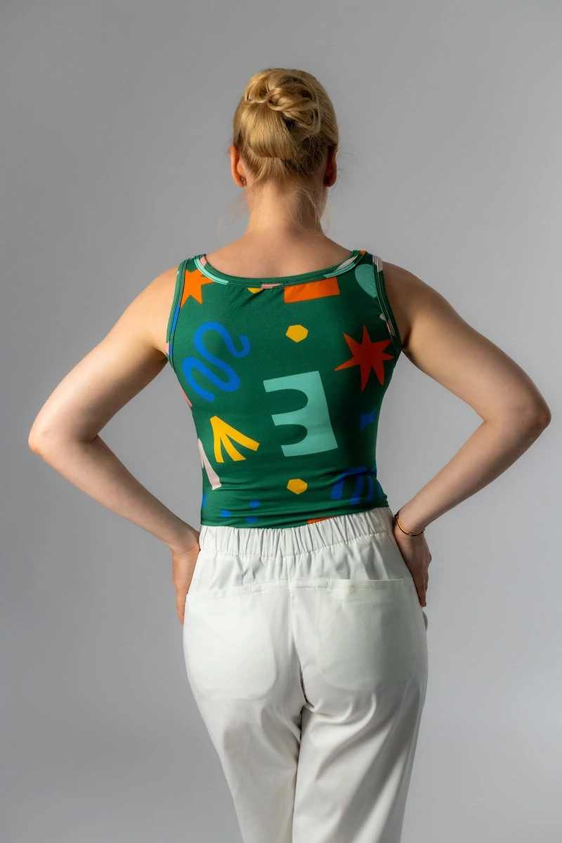 Az ALLIS ujjatlan női orvosi trikó tökéletes választás a meleg napokra vagy réteges öltözködéshez. Különlegességét a prémium olasz viszkóz jersey alapanyag adja, amely kellemesen rugalmas, légáteresztő és finoman követi a test vonalát. Digitálisan nyomott, látványos mintája vidámságot visz a mindennapokba, miközben kifinomult megjelenést biztosít – akár a rendelőn kívül is.