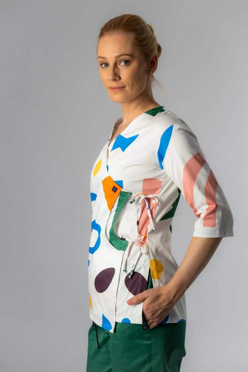 A háromnegyedes ujjú női orvosi tunika könnyed, A-vonalú szabásával és állítható megkötőivel maximális kényelmet biztosít a rendelői napokra. Oldalt elhelyezett saját anyagból készült megkötői lehetővé teszik a bőség egyéni igények szerinti szabályozását, így minden testalkaton jól mutat.