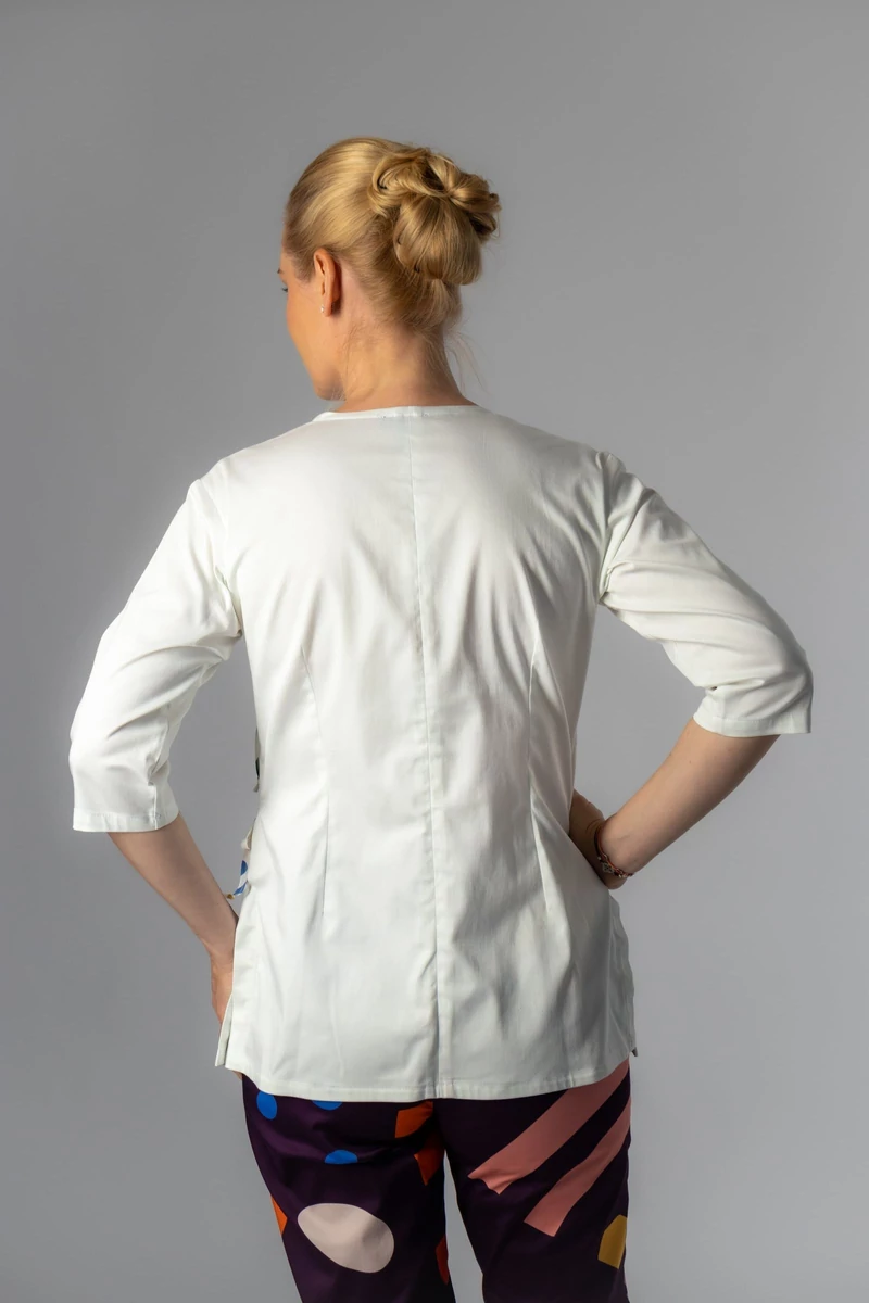 A háromnegyedes ujjú női orvosi tunika könnyed, A-vonalú szabásával és állítható megkötőivel maximális kényelmet biztosít a rendelői napokra. Oldalt elhelyezett saját anyagból készült megkötői lehetővé teszik a bőség egyéni igények szerinti szabályozását, így minden testalkaton jól mutat.