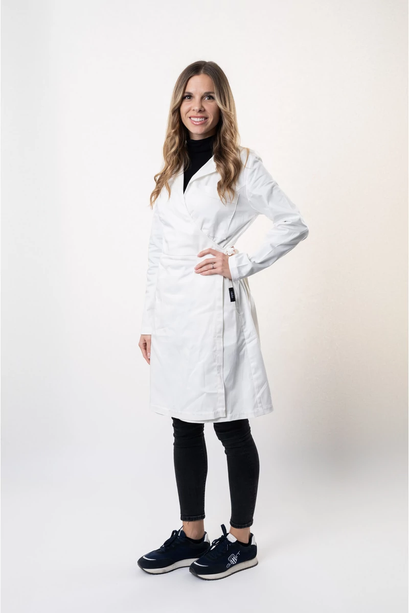 Az átkötős, oldalrögzítésű fazon kényelmesen követi a test vonalát, miközben teljes fedést ad. A karcsúsított szabás és a hosszú ujj diszkrét, elegáns megjelenést kölcsönöz – ideális mindennapi viselet laborban, klinikán vagy gyógyszertárban.