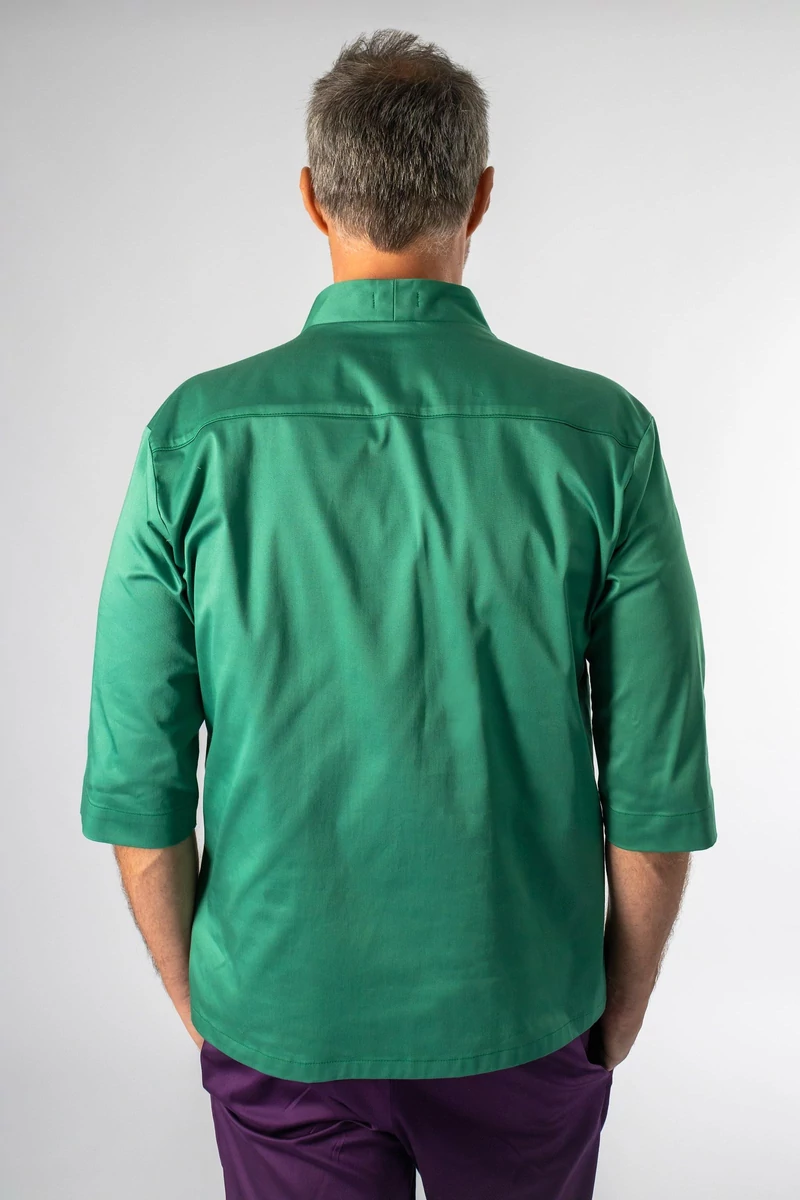 Háromnegyedes ujjú orvosi felső modern, visszafogott megjelenést kínál. Letisztult nyakkivágása rejtett patenttal záródik, így elegáns, mégis praktikus viselet a mindennapokban. A bal mellrészen található tolltartó zseb és a praktikus kártyatartó fül a mindennapi munka kényelmét szolgálja.